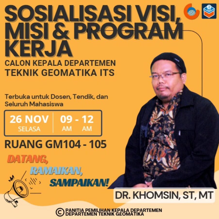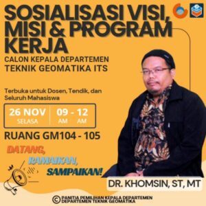 📢 Mari bersama menghadiri Sosialisasi Visi, Misi, dan Program Kerja dari Calon Kepala Departemen Teknik Geomatika ITS, Dr. Khomsin, ST, MT!