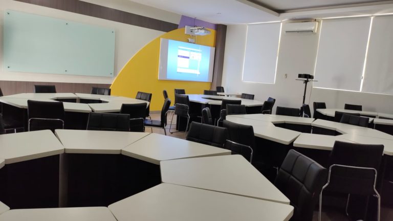 Ruang kelas dilengkapi fasilitas standar berkapasitas 40 orang, papan tulis white board, LCD projector, dan pendingin ruangan.