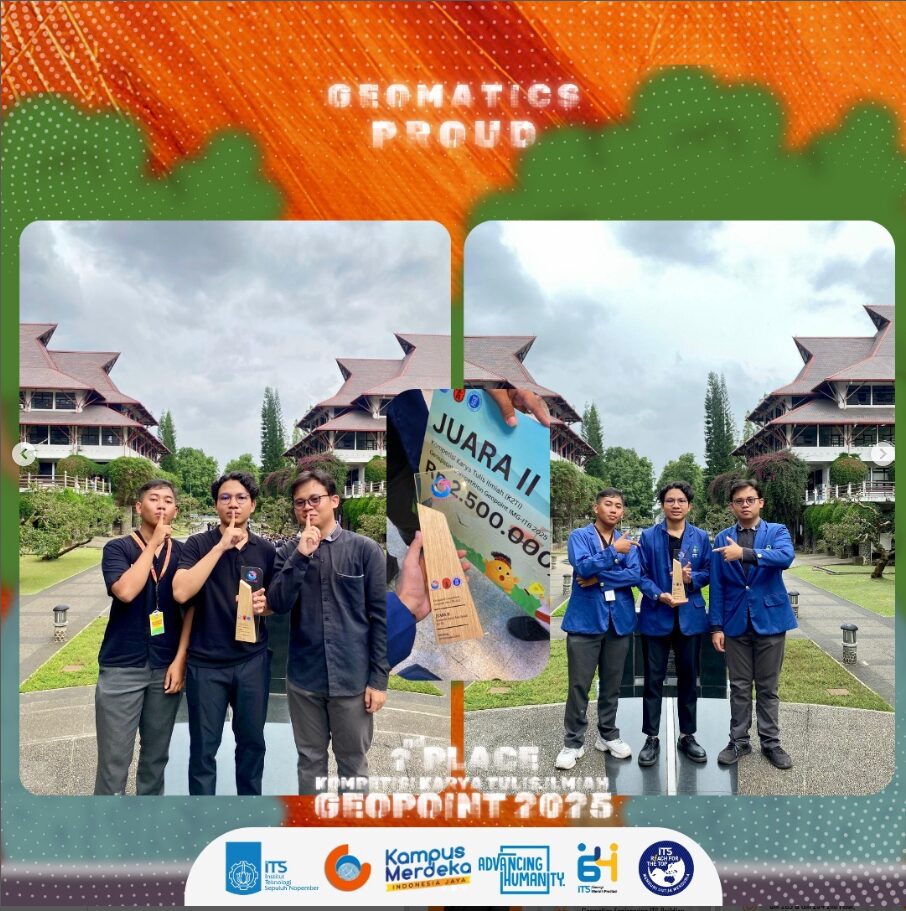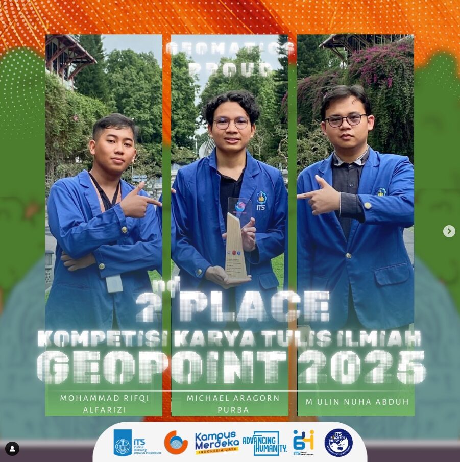 Michael Aragorn Purba (Geomatika 2022), Mohammad Rifqi Alfarizi (Geomatika 2022), dan M Ulin Nuha Abduh (Geofisika 2022) yang sukses membawa nama ITS menjadi juara 2 di Lomba Karya Tulis Ilmiah GEOPOINT ITB 2025!