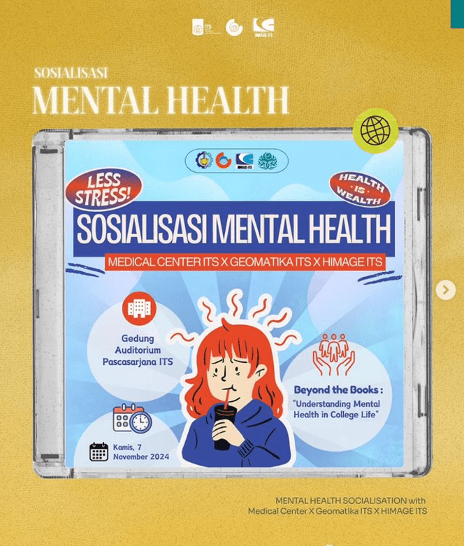 🤯 Are you really tired of your campus routine? 🤯 Or do you feel like your stress is never ending? Come on, take a break and join the MENTAL HEALTH SOCIALIZATION with Medical Center X Geomatika ITS X HIMAGE ITS! It’s time to relax, recharge, and get anti-stress tips that will definitely make your mentality stronger! 🌈
