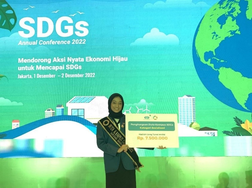 Azeva Haqqi after receiving the award as the SDGs Campus Ambassador in the Socialization category representing ITS in Jakarta.