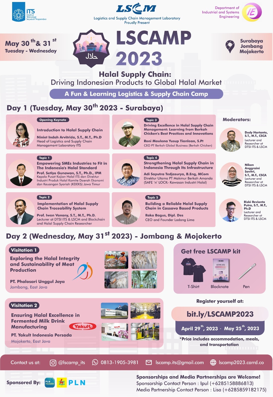 The first day of LSCAMP 2023 will feature a seminar and discussions that will be delivered by the experts of halal businesses and supply chains, and the second day will be industrial visits to PT Phalosari Unggul Jaya – Jombang (a modern chicken slaughter house company) and PT Yakult Indonesia Persada – Mojokerto. LSCAMP 2023 is open for academics, practitioners, students and public.