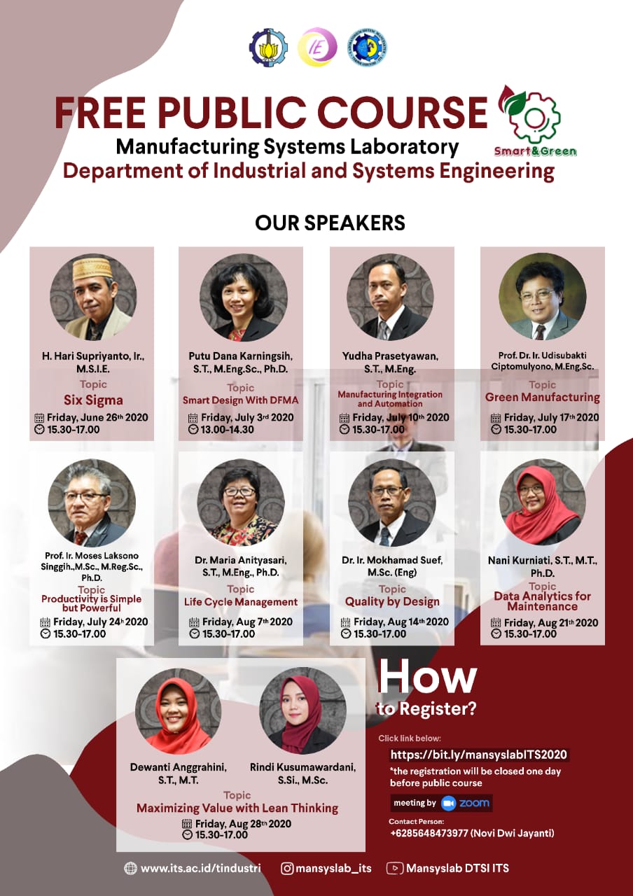 Topik: Six Sigma, Smart Design with Design For Manufacturing Assembly, Manufacturing Integration and Automation, Green Manufacturing, Productivity is Simple but Powerful, Life Cycle Management, Quality by Design, Data Analytics for Maintenance, Maximising Value with Lean Thinking