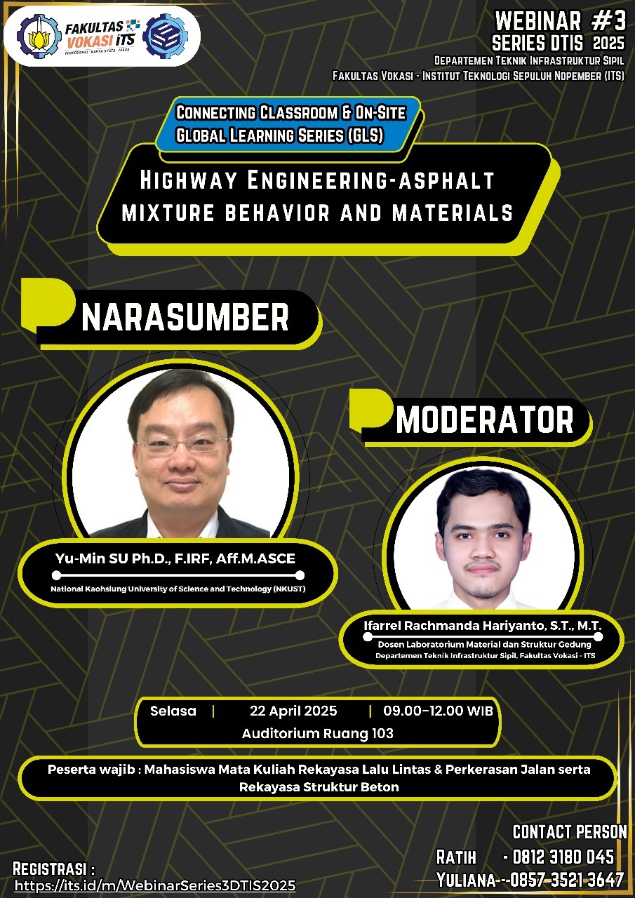 KULIAH TAMU INTERNASIONAL Departemen Teknik Infrastruktur Sipil, Fakultas Vokasi – ITS dengan bangga mengundang anda semua untuk mengikuti Kuliah Tamu bersama narasumber internasional dari Taiwan! 🌏✨