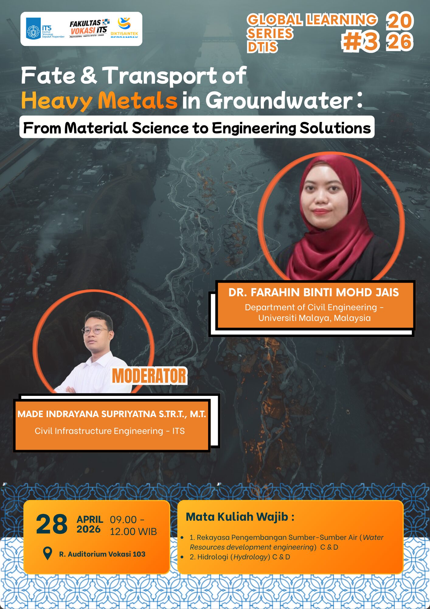 GLS DTIS #3 Institut Teknologi Sepuluh Nopember hadirkan Dr. Farahin Binti Mohd Jais, 28 April 2026, bahas logam berat air tanah.