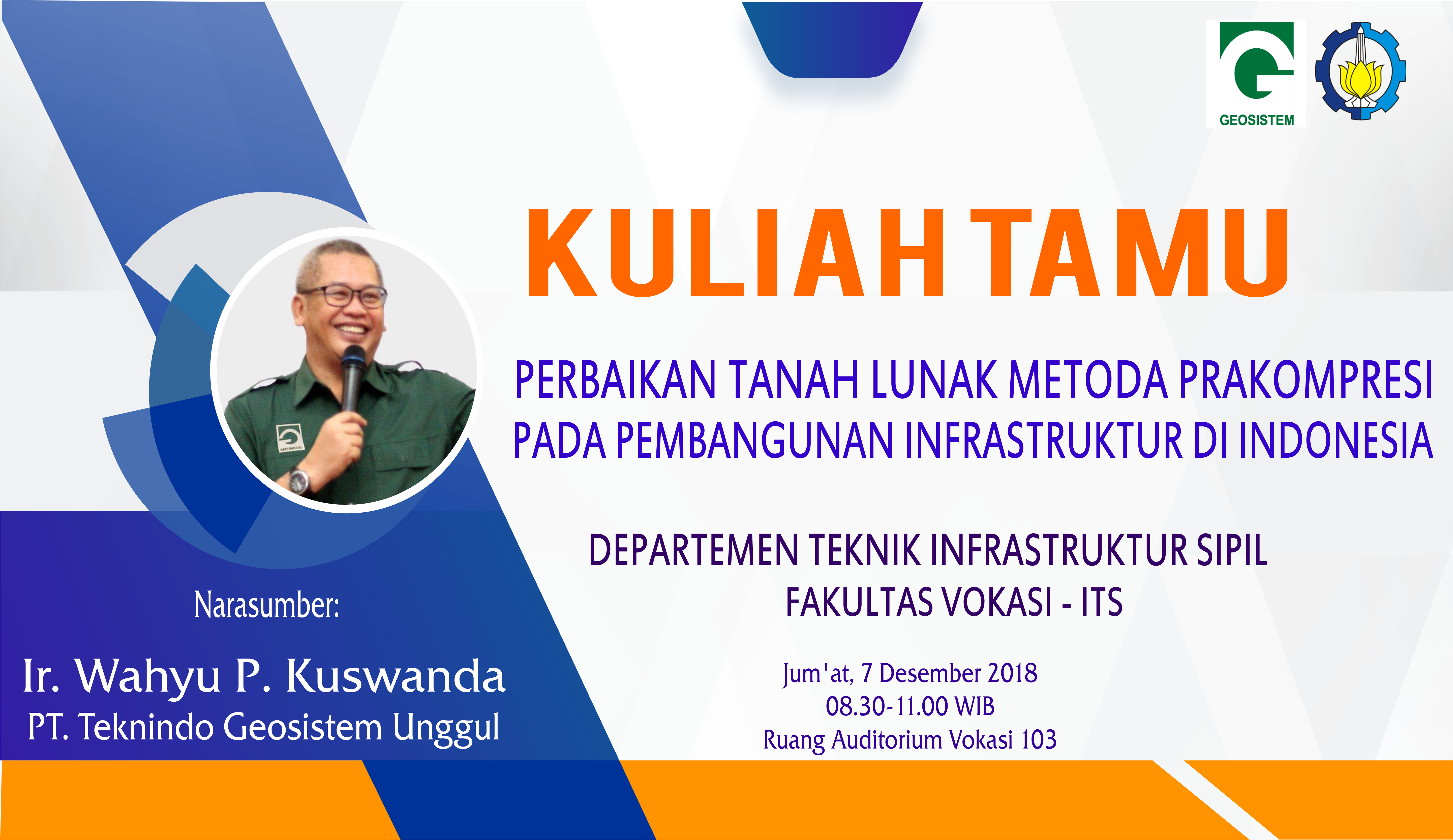 Bagi kamu mahasiswa Departemen Teknik Infrastruktur Sipil, ayo hadir pada kuliah umum dengan topik menarik “Perbaikan Tanah Lunak Metoda Prakompresi Pada Pembangunan Infrastruktur di Indonesia” dengan narasumber Ir. Wahyu P. Kuswanda
