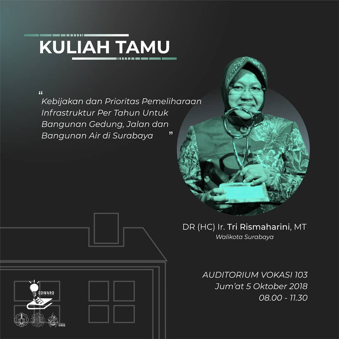 Hari : Jum’at, 5 Oktober 2018 Tempat : Auditorium Vokasi 103 Kampus ITS Manyar Tema : Kebijakan dan Prioritas Infrastruktur Per Tahun Untuk Bangunan Gedung, Jalan dan Bangunan Air di Surabaya