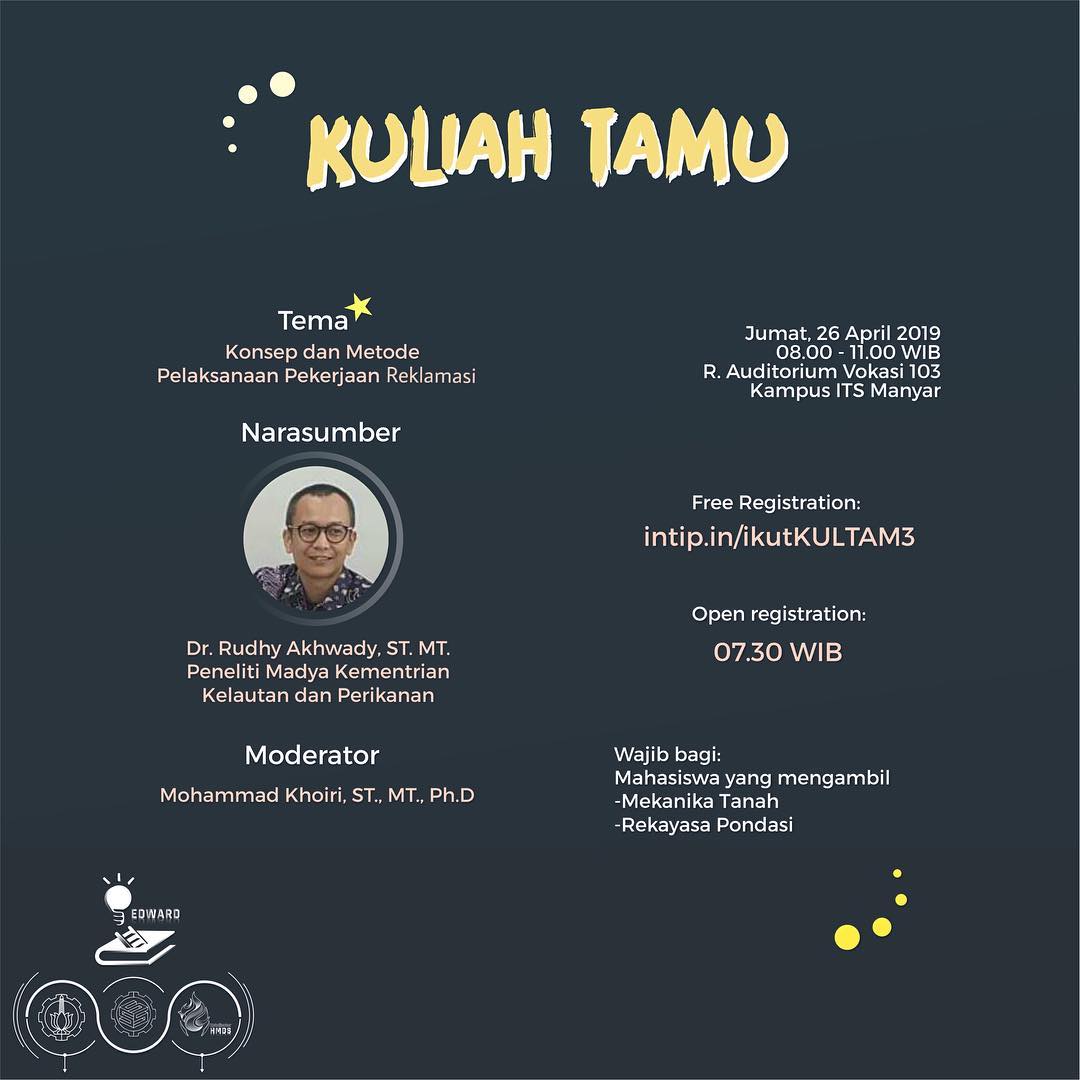 Bagi kamu mahasiswa Departemen Teknik Infrastruktur Sipil, ayo hadir pada kuliah tamu dengan topik “Konsep dan Metode Pelaksanaan Pekerjaan Reklamasi” dan narasumber dari Kementrian Kelautan dan Perikanan.