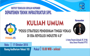 Bagi Anda mahasiswa Jurusan Teknik Infrastruktur Sipil, hadiri kuliah umum dengan tema Posisi Strategis Pendidikan Tinggi Vokasi di Era Revolusi Industri 4.0 dengan pembicara Ir. Hotma Prawoto Sulistyadi, MT., IP-Md.