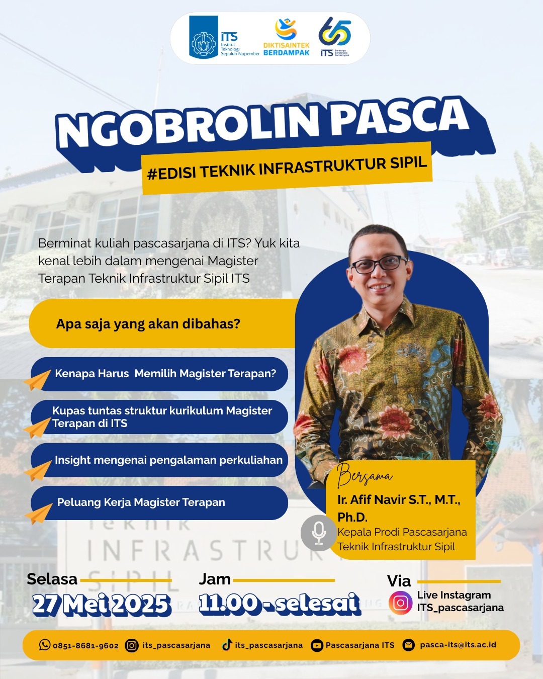 🗓️ Tanggal: Selasa, 27 Mei 2025 🕚 Pukul: 11.00 WIB – selesai 📍 Live via Instagram: @ITS_pascasarjana