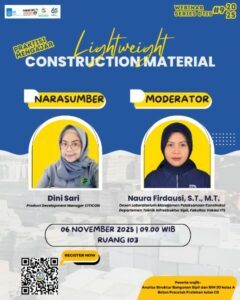 This insightful event will feature Ms. Dini Sari, Product Development Manager at CITICON, as the guest speaker. She will share her expertise and professional experiences in the development and application of lightweight construction materials, which have become a key innovation in modern infrastructure. These materials are gaining popularity due to their ability to enhance construction efficiency, reduce structural loads, and promote environmental sustainability — all of which are essential for the future of the construction industry.
