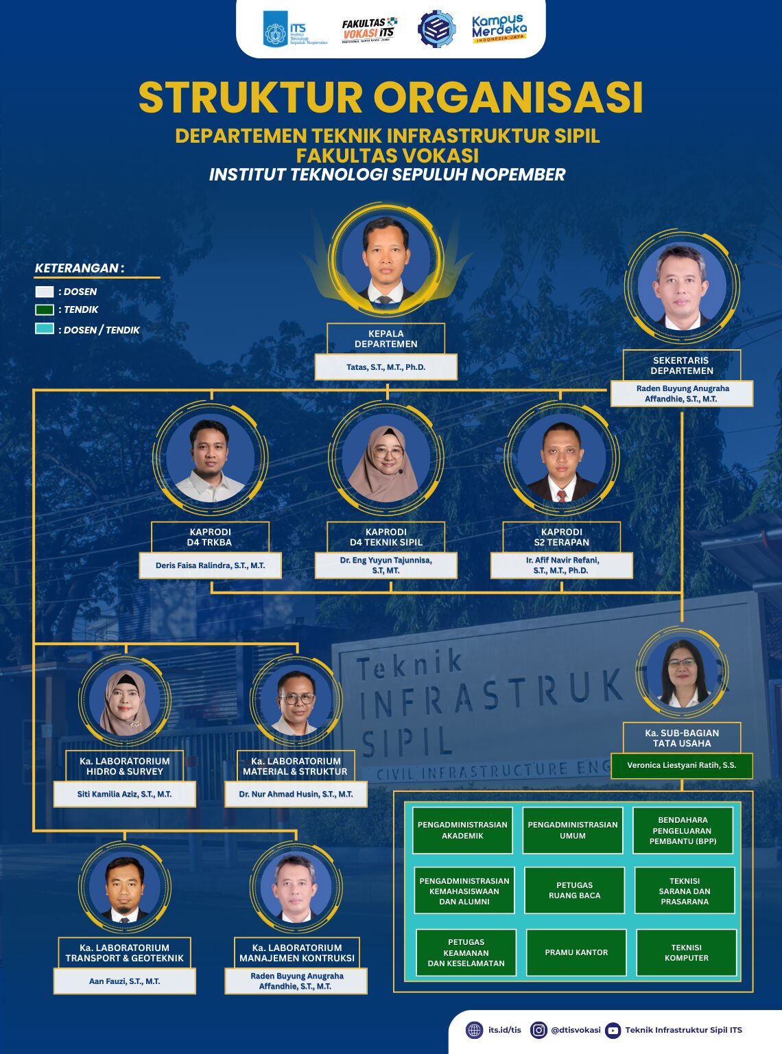 Dalam menjalankan kegiatan operasionalnya DTIS-ITS telah membentuk struktur organisasi yang kompatibel dengan struktur organisasi ITS. Dalam pelaksanaan program DTIS-ITS, Kepala Departemen dibantu oleh Sekretaris Departemen, Kepala Program Studi Diploma Empat (D4), Kepala Program Studi S2 Terapan, Kepala Laboratorium yang bertanggung jawab atas Kepemimpinan Operasional di Laboratorium dan Kepala staf non akademik (Kasubag TU) yang membantu dalam Sumber Daya Keuangan. Dalam melakukan kegiatan akademik, Kepala Program Studi berkoordinasi dengan kepala RMK (Kepala Kursus Cluster) dalam merumuskan dan mengevaluasi kurikulum.