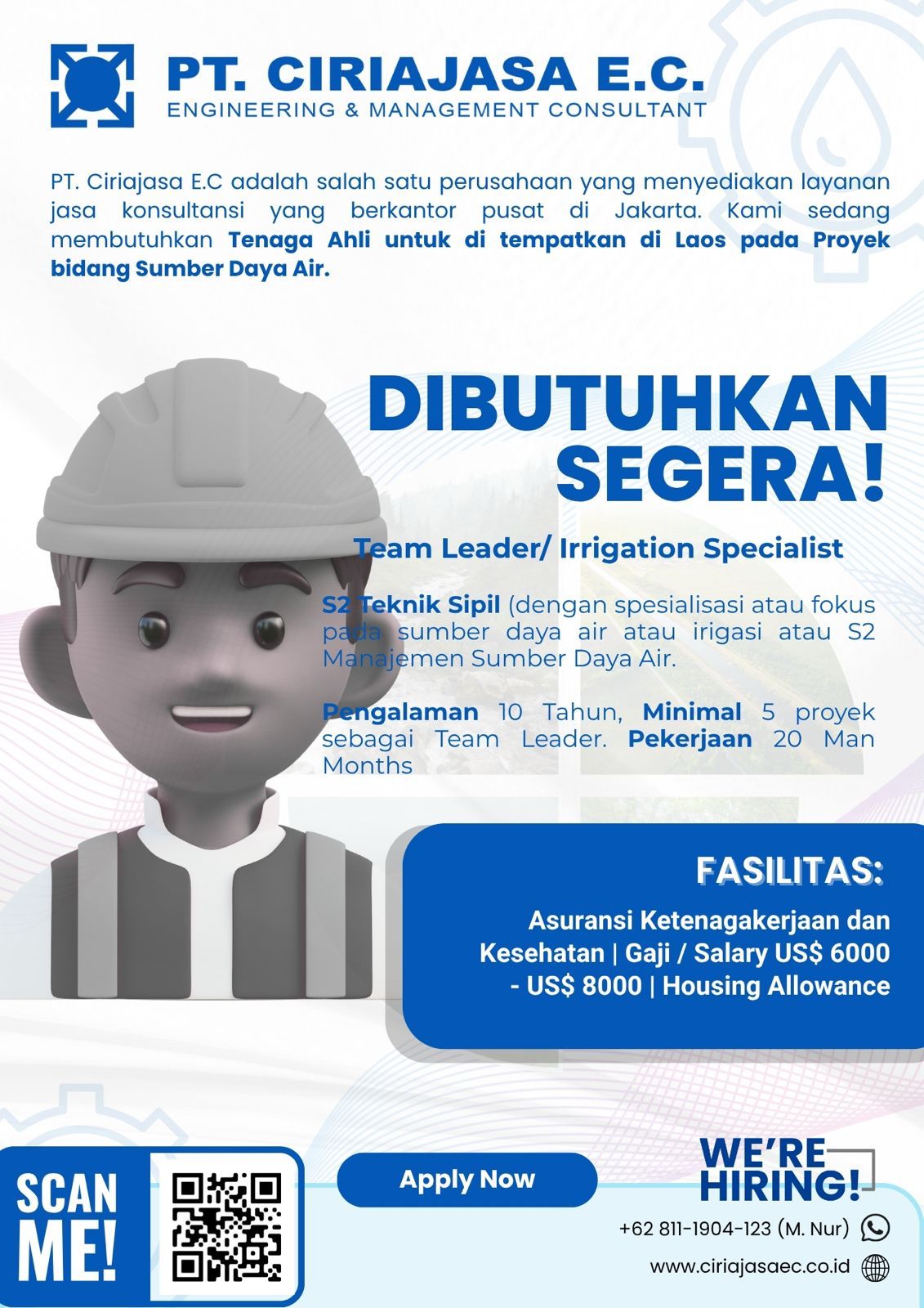 PT. Ciriajasa E.C. merupakan perusahaan terkemuka yang bergerak di bidang jasa konsultan teknik dan manajemen. Berkantor pusat di Jakarta, kami telah berpengalaman menangani berbagai proyek besar, baik nasional maupun internasional. Saat ini, kami sedang membuka kesempatan emas bagi tenaga profesional untuk bergabung bersama kami dalam proyek di Laos, khususnya dalam bidang Sumber Daya Air.