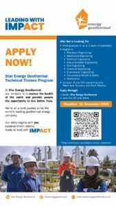 Star Energy Geothermal (SEG) kembali membuka kesempatan bagi talenta muda Indonesia untuk bergabung dalam Technical Trainee Program. Program ini dirancang khusus bagi fresh graduate atau profesional muda dengan pengalaman maksimal dua tahun yang memiliki semangat untuk berkontribusi pada energi bersih dan keberlanjutan bumi.
