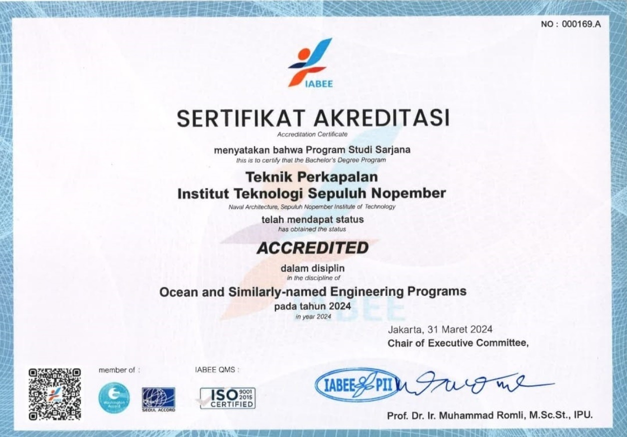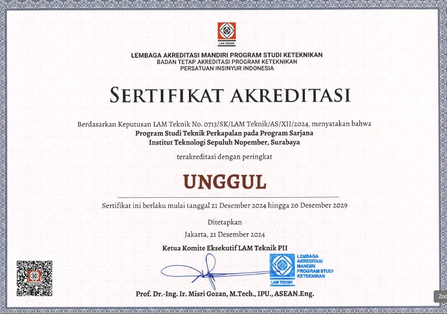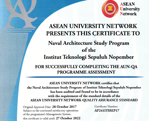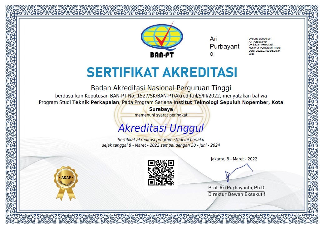 Program Studi Sarjana (S1) Reguler dan Double Degree Departemen Teknik Perkapalan memperoleh akreditasi tertinggi “A” dari BAN-PT serta mendapatkan sertifikasi dari badan internasional AUN-QA. Berikut adalah bukti sertifikat akreditasi dari kedua badan sertifikasi: