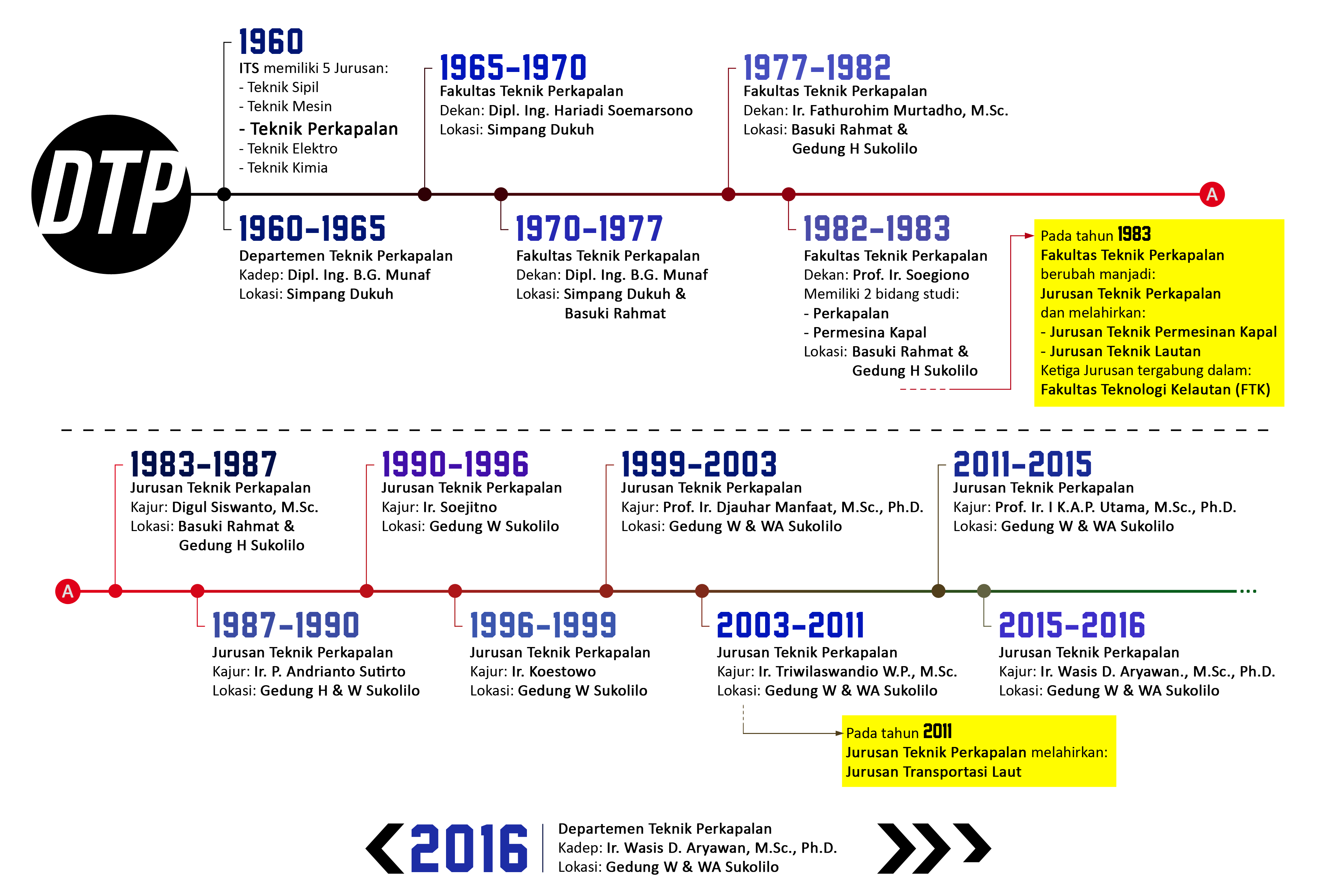 Departemen Teknik Perkapalan (DTP) didirikan pada tahun 1960 bersama dengan lahirnya Institut Teknologi Sepuluh Nopember (ITS). Diagram dibawah ini menjelaskan perkembangan departemen terkait perubahan nama, status, lokasi kampus, dan kepala departemen.