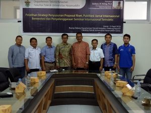 Keesokan harinya, Jumat 13 April 2018, acara dilanjutkan dengan “Pelatihan Strategi Penyusunan Proposal Riset, Publikasi Jurnal Internasional Bereputasi dan Penyelenggaraan Seminar Internasional Terindeks” yang diikuti oleh dosen-dosen Departemen Teknik Kelautan UNHAS. Untuk mendapatkan pendanaan penelitian dari Ristekdikti misalnya, diperlukan kualitas proposal yang bermutu. Hal ini dapat dicapai dengan pemahaman yang benar tentang proposal riset itu ditambah jam terbang yang memadai. Artinya pendanaan penelitian level nasional/internasional kemungkinan besar bisa didapatkan jika sudah memiliki rekam jejak penelitian skala di bawahnya. Dengan kebijakan saat ini di lingkup Ristekdikti, publikasi ilmiah dosen akan mendapat nilai terbesar jika masuk dalam kategori jurnal bereputasi. Pada dasarnya, jurnal bereputasi bisa ditembus dengan dua kondisi yaitu substansi materi makalahnya (yang diperoleh dari mutu riset yang baik) serta tata tulis yang baik dan standar