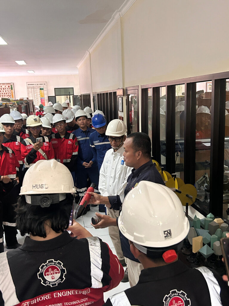 Kampus ITS, ITS News — Sebanyak 55 mahasiswa Program Studi Teknik Lepas Pantai ITS angkatan 2023 dan 2024 mendapat kesempatan memperluas wawasan industri migas melalui kegiatan kuliah lapangan di Pusat Pengembangan Sumber Daya Manusia (PPSDM) Migas Cepu, Rabu (26/11). Kunjungan ini menghadirkan pengalaman langsung pengenalan mengenai proses hulu hingga hilir migas, mencakup laboratorium pengujian, rig pembelajaran, laboratorium produksi, fasilitas kilang, serta sesi khusus operasi rig dan standar keselamatan.
