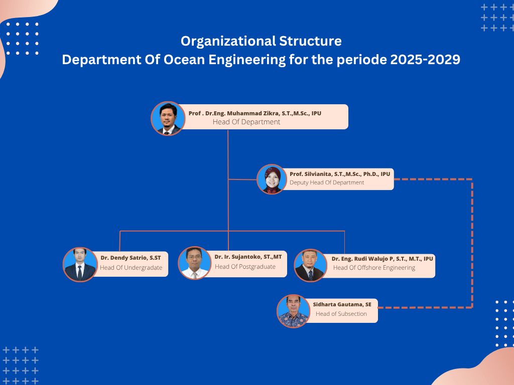 In carrying out its operational activities, the Department of Ocean Engineering at ITS (DTK-ITS) has established an organizational structure that is compatible with the organizational structure of ITS. In the implementation of the programs of the Department of Ocean Engineering (DTK-ITS), the Department Head is assisted by the Department Secretary (in charge of HR and Finance), the Bachelor’s Program Coordinator (in charge of Academics and Student Affairs), the Head of the Offshore Engineering (TLP) Undergraduate Program, the Head of the Graduate Program (Master’s and Doctoral), the Head of the Laboratory responsible for Operational Leadership in the Laboratory, and the Head of Non-Academic Staff (Administration Section Head) who assists in Financial Resources.