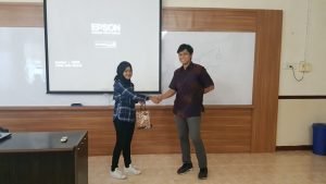 Pemberian cinderamata oleh dosen muda DTK Raditya Danu Riyanto, ST, MT. kepada nara sumber Kuliah Tamu Hutami Widya Arini, ST.