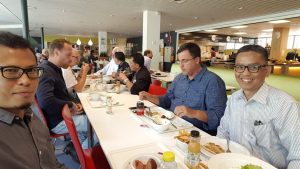 Sesi pagi dengan agenda diskusi tentang sedikit penyesuaian kembali agenda-agenda yang akan dilakukan selama kunjungan, evaluasi dan rencana isu gender dalam program dan diskusi tentang pelaksanaan seminar ISOCEEN-2018 dan rencana ISOCEEN-2019. Yang hadir dari pihak Belanda adalah Prof. Alvaro (dari IHE), Pak Bert (perwakilan NUFFIC), Prof. Henk (dari TU-Delft/IHE), Dr. Ali (dari IHE) dan Dr. Lillianne (dari HZ-Univ/Deltares).