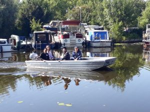 Uji coba perahu survey yang sudah dipesan di kanal/sungai sekitar Delft.