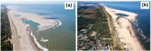 (a) Bentuk timbunan Sand Engine pada Juli 2011 segera setelah dibangun, (b) Bentuk Sand Engine setelah mengalami proses penyebaran sedimennya oleh gelombang dan arus laut.
