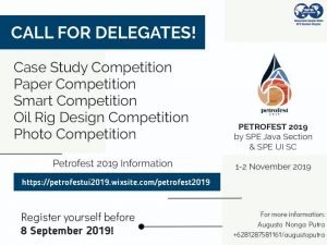 PETROFEST 2019 adalah acara tahunan terbesar dari Society of Petroleum Engineers (SPE) Java Section bekerja sama dengan SPE Student Chapter, yang tahun ini Universitas Indonesia terpilih menjadi penyelenggaranya. Petrofest 2019 mengangkat tema “The Challenge of Unconventional Petroleum Resources to Face Current Energy Situations” dengan harapan ke depannya lahir para pioner-pioner dalam bidang energi yang mampu memperbaiki kondisi nasional dan memaksimalkan sektor energi terbarukan.