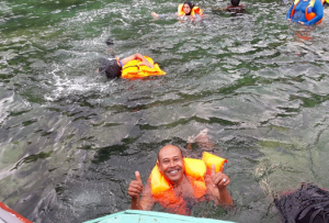 Tidak sampai sampai disana, peserta Wisata APTEKIM kemudian menuju ke Kawasan Sungai Gemuruh untuk mandi air sungai dan mengganti pakaian yang basah seusai menyelam.