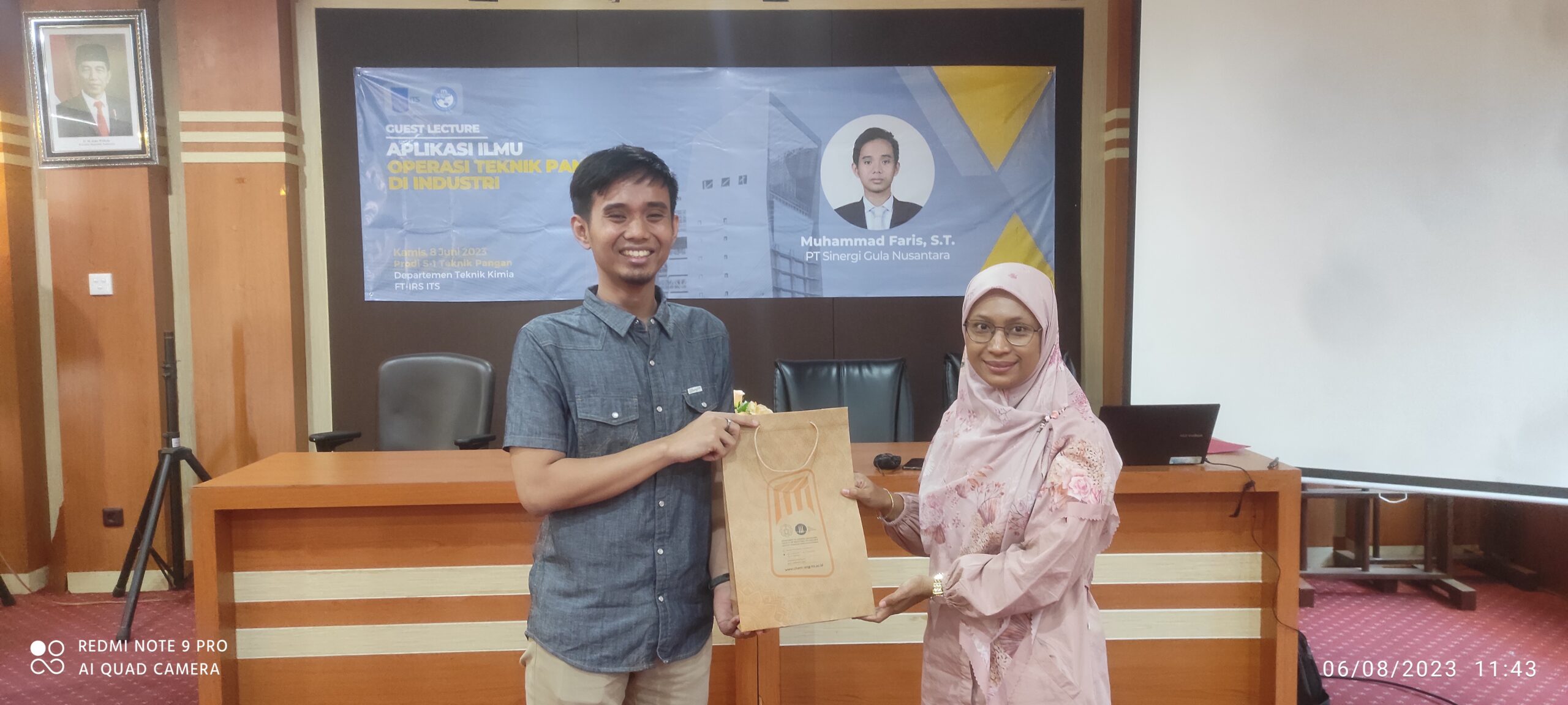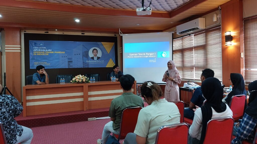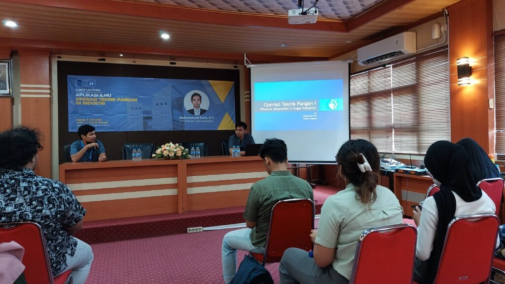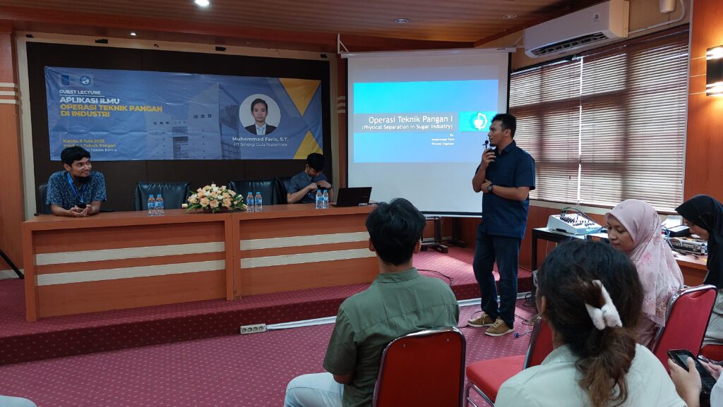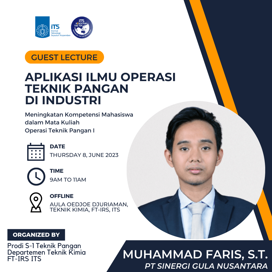Sebagai rangkaian Kuliah Tamu yang diadakan Prodi S1 Teknik Pangan Departemen Teknik Kimia ITS, pada Kamis, 8 Juni 2023 telah dilaksanakan Guest Lecture “Aplikasi Ilmu Operasi Teknik Pangan di Industri” yang disampaikan secara langsung oleh Bapak Muhammad Faris, S.T. dari PT Sinergi Gula Nusantara.