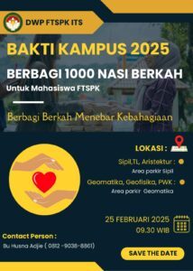 π Hari/Tanggal: Selasa, 25 Februari 2025 π Waktu: 09.30 WIB – selesai π Lokasi: 1. Sipil, TL, Ars : area parkir Sipil. 2. Geomatika, Geofisika, PWK : area parkir Geomatika