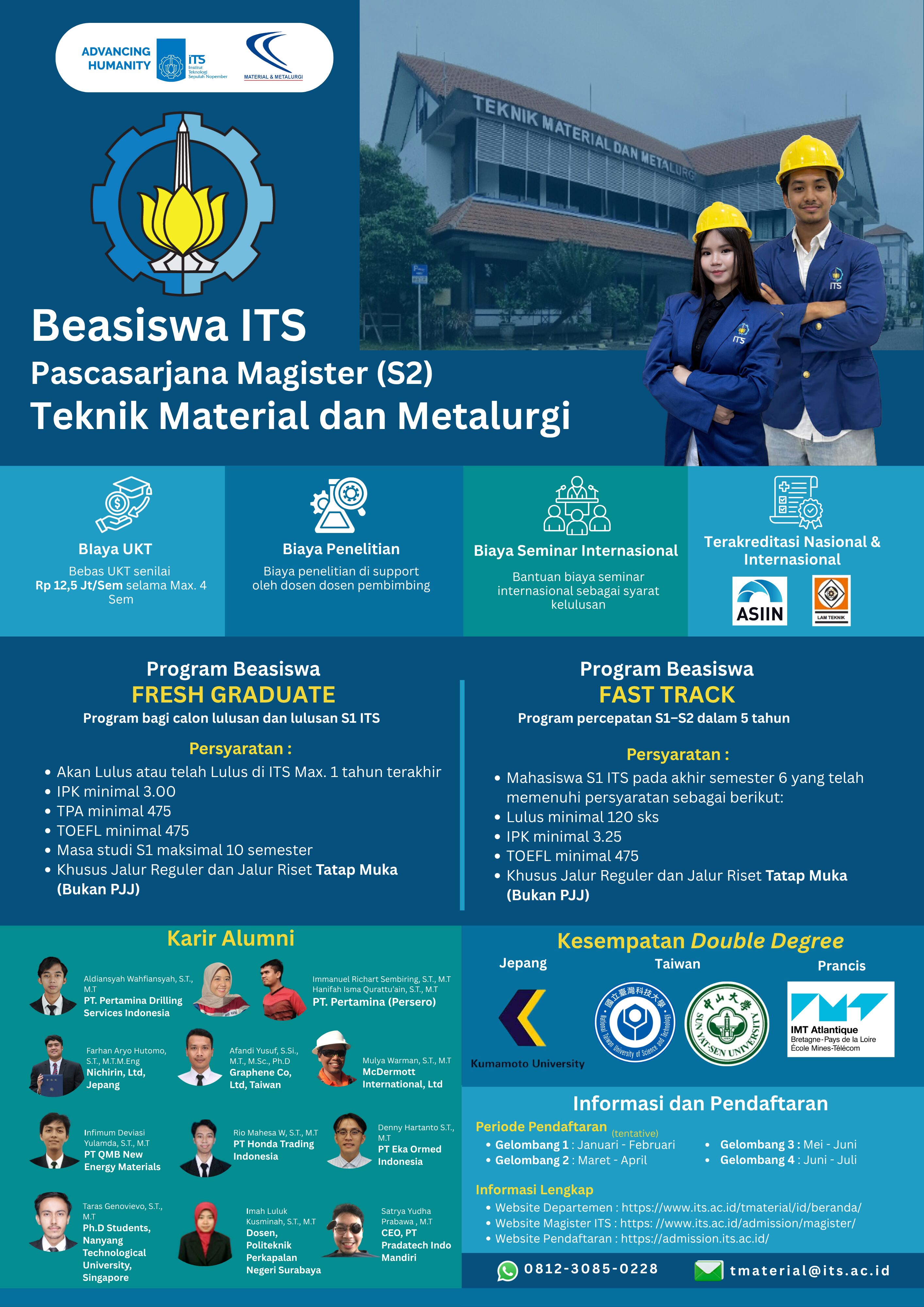 ITS offers admission to undergraduate (S1) programs through SNMPTN, SBMPTN, and the Partnership and Independent Program (PKM). Postgraduate (S2 and S3) programs are available through the Graduate School Program. Prospective international students in the Department of Materials Engineering and Metallurgy can apply through the International Office.