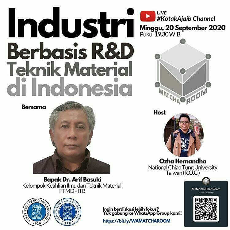 Berkolaborasi dengan Fakultas Teknik Mesin dan Dirgantara (FTMD), Institut Teknologi Bandung (ITB), MATCHA ROOM sesi kali ini mengundang Bapak Dr. Arif Basuki, salah seorang senior di Kelompok Keahlian Ilmu dan Teknik Material, FTMD-ITB. Kita akan bersama-sama mencari tahu tentang topik tersebut secara interaktif, sederhana, santai, dan tentunya akan menambah wawasan.