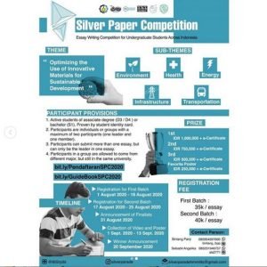 📣 Silver Paper Competition adalah kompetisi antar mahasiswa dalam bidang karya tulis berupa esai dengan tema “Optimalisasi Pemanfaatan Material Inovatif Untuk Pembangunan Berkelanjutan”.