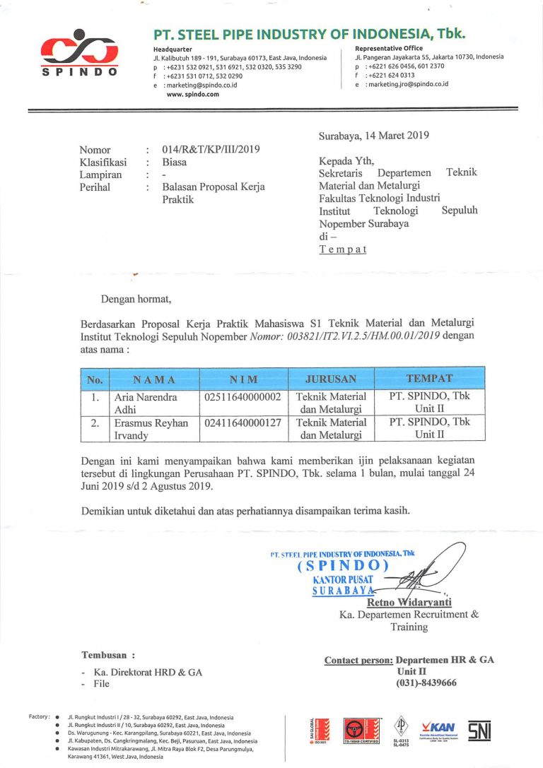 Acceptance of Job Training PT. Spindo on behalf of the students of the FTI