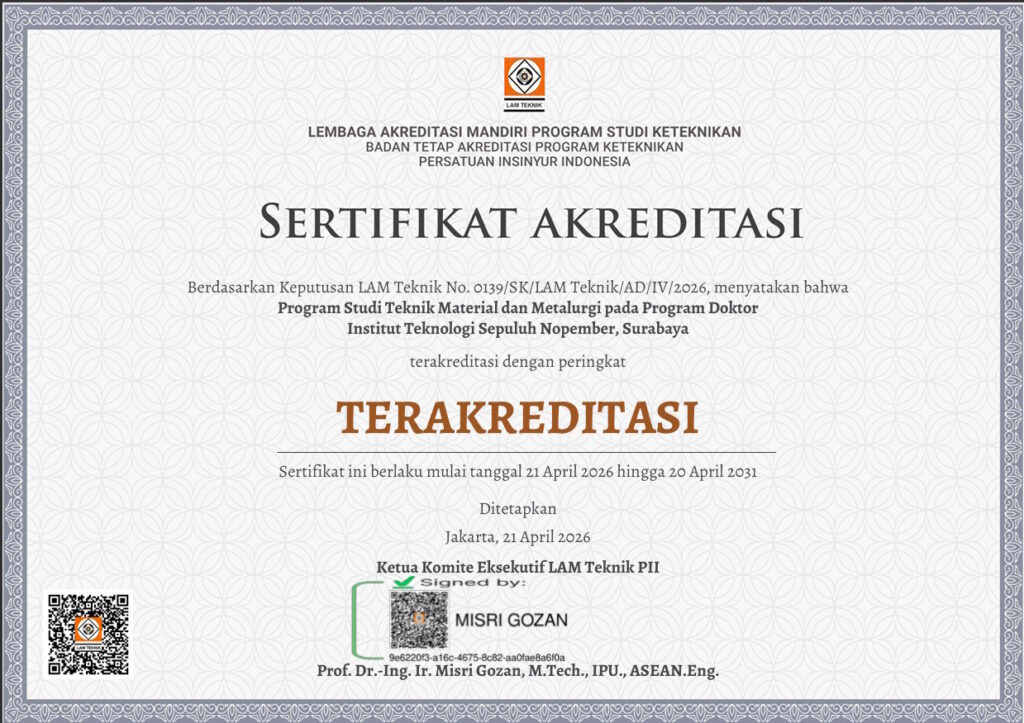 Department of Material and Metallurgical Engineering ITS has a reputation at the national and international level. This is evidenced by accreditation and certificates that guarantee the quality of education and research in the Department of Material and Metallurgical Engineering. Find information about accreditation and certificates using Material Engineering and Combining.