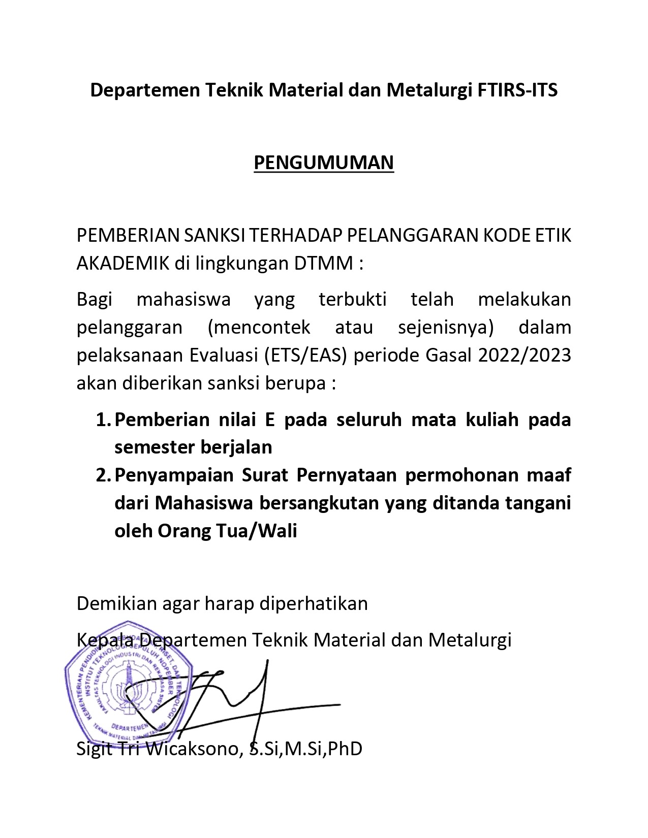 Bagi mahasiswa yang terbukti telah melakukan pelanggaran (mencontek atau sejenisnya) dalam pelaksanaan Evaluasi (ETS/EAS) periode Gasal 2022/2023 akan diberikan sanksi berupa :