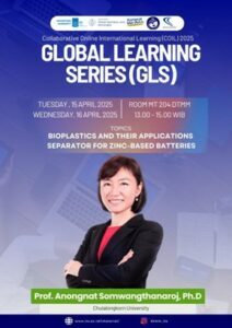 17 April 2025 – Departemen Teknik Material dan Metalurgi (DTMM), Fakultas Teknik, kembali melanjutkan program internasional Global Learning Series (GLS) dengan menghadirkan pakar terkemuka dari Thailand, Prof. Anongnat Somwangthanaroj, Ph.D. Kuliah bertema “Bioplastics and Their Applications Separator for Zinc-Based Batteries” ini berlangsung pada 15–16 April 2025 di Room MT 204 DTMM dan dihadiri oleh mahasiswa, dosen, serta peneliti di bidang material dan energi terbarukan.