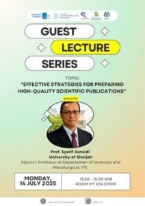 July 16, 2025 – The Department of Materials and Metallurgical Engineering (DTMM), Faculty of Engineering, once again held an academic event under the Guest Lecture Series aimed at enhancing the research and publication skills of the academic community. This session featured the lecture “Effective Strategies for Preparing High-Quality Scientific Publications”, with Prof. Syarif Junaidi as the main speaker.
