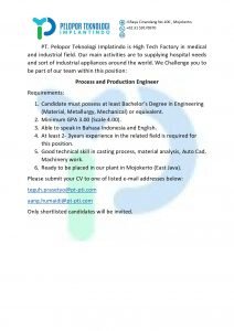 PT. Pelopor Teknologi Implantindo is high tech factory in medical and industrial field. Our main activities are to supplying hospital needs and sort of industrial appliances around the world. We challenge you to be part of our team within this position :