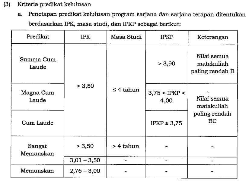 Students are declared to have passed if they have successfully completed the entire study load of 144 credits including the final assignment and have learning outcomes targeted by the study program without the D and E grades; and fulfill the minimum value requirements of one of the Foreign Languages 477 and SKEM 1300. And upload 1 (one) final assignment-based scientific article on the official portal of Institut Teknologi Sepuluh Nopember.