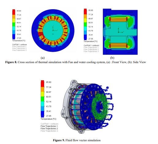 Pada penelitian ini penulis memodelkan motor dengan Ansys Maxwell untuk mendapatkan model parameter sumber panas dari geometri motor. Software Fluent digunakan untuk melakukan Simulasi temperatur pada motor menggunakan sistem pendingin yang dirancang, kemudian divalidasi dengan percobaan. Analisis termal penelitian ini membandingkan performa motor dengan penggunaan air dan minyak. Kecepatan aliran dibandingkan dengan efisiensi daya radiator.