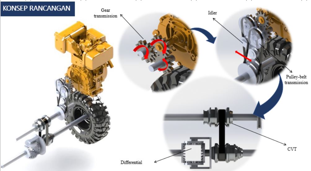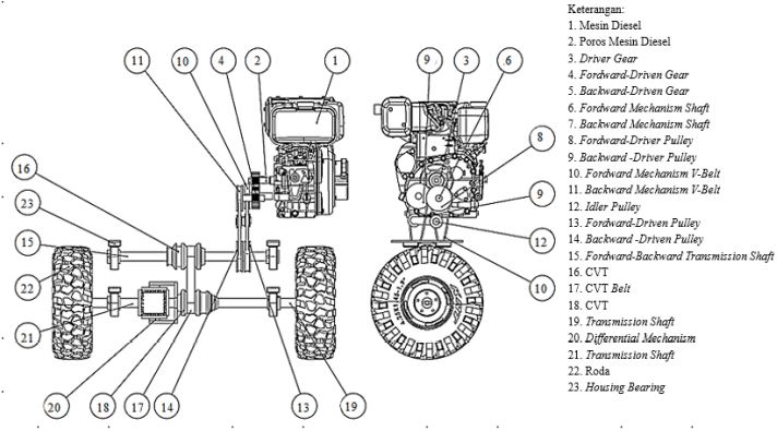 Dalam penelitian ini dilakukan perancangan dan analisa sistem transmisi infrastuctural mobile dari hasil pertanian. Sumber daya yang digunakan adalah mesin diesel. Putaran mesin diesel ini di transmisikan dengan roda gigi sehingga menghasilkan dua output yang berlawanan arah. Masing-masing roda gigi yang berlawanan arah ini dihubungkan dengan poros transmisi yang menggerakkan pulley. Transmisi pulley- v belt dengan putaran yang berlawanan arah ini selanjutnya menggerakkan poros transmisi satu. Selanjutya putaran dari poros transmisi satu ke poros transmisi dua dihubungkan dengan CVT untuk mendapatkan differential kecepatan. Selanjutnya poros transmisi dua yang terhubung ke roda kiri dihubungkan ke poros roda kanan dengan mekanisme diffenrential.