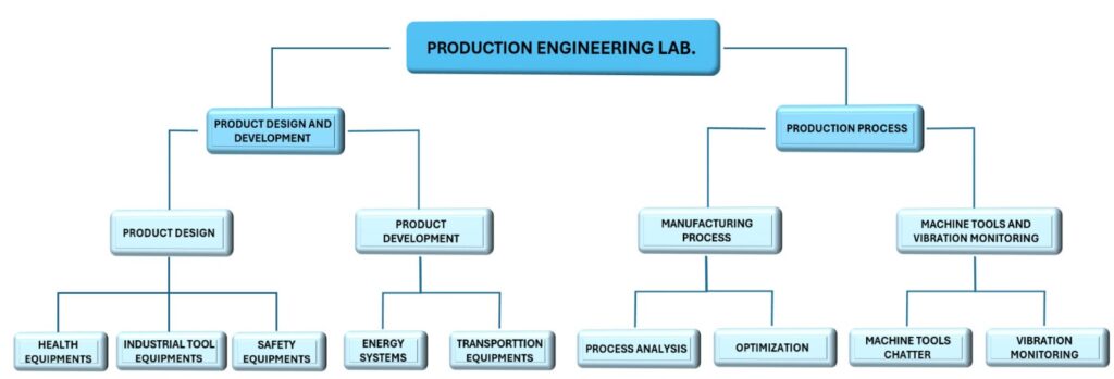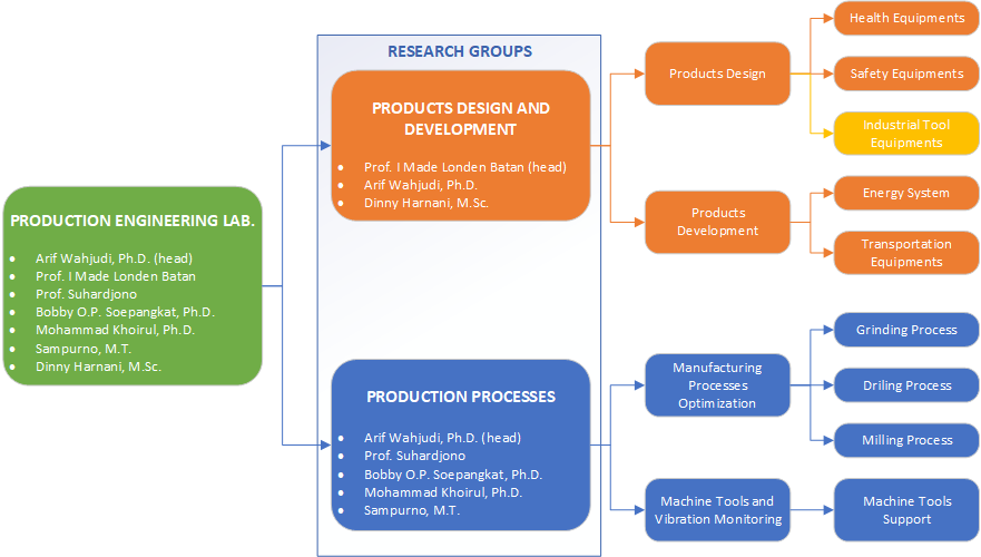 Sejak awal tahun 2020, Laboratorium Rekayasa Produksi tersusun dari 2 fokus Grup Riset (kelompok penelitian) yaitu Grup Riset Manufaktur dan Grup Riset Perancangan dan Pengembangan Produk (P3) yang mana dilengkapi dengan tema penelitian umum masing-masing grup riset.