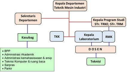 In carrying out its operational activities the Department of Industrial Mechanical Engineering (DTMI) -ITS has formed an organizational structure compatible with ITS organizational structure. In the implementation of the DTMI-ITS program, the Head of the Department is assisted by the Secretary of the Department, the Head of the laboratory responsible for Operational Leadership in the Laboratory and the non-academic Chief of Staff (Head of Sub-Section) who assists in Financial Resources and Administration.