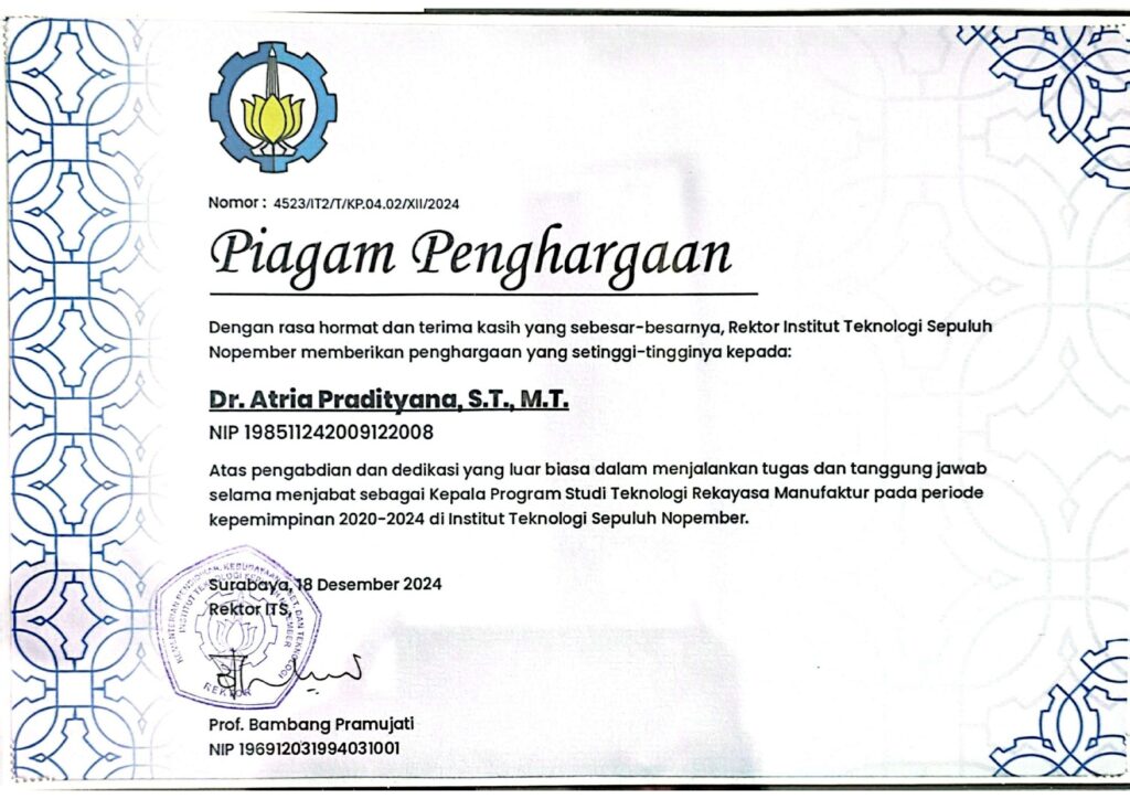 Perhargaan atas pengabdian dan dedikasi dalam menjalankan tanggung jawab selama menjabat sebagai Kepala Program Studi Teknologi Rekayasa Manufaktur.