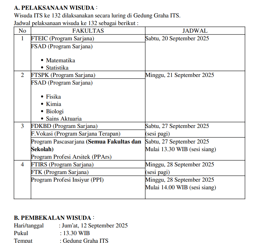 ๐ŸŽ“ Wisuda ITS ke-132 โ€“ September 2025 ๐Ÿ“ Tempat: Graha ITS, Surabaya ๐Ÿ“… Jadwal Wisuda Sabtu, 20 Sept 2025