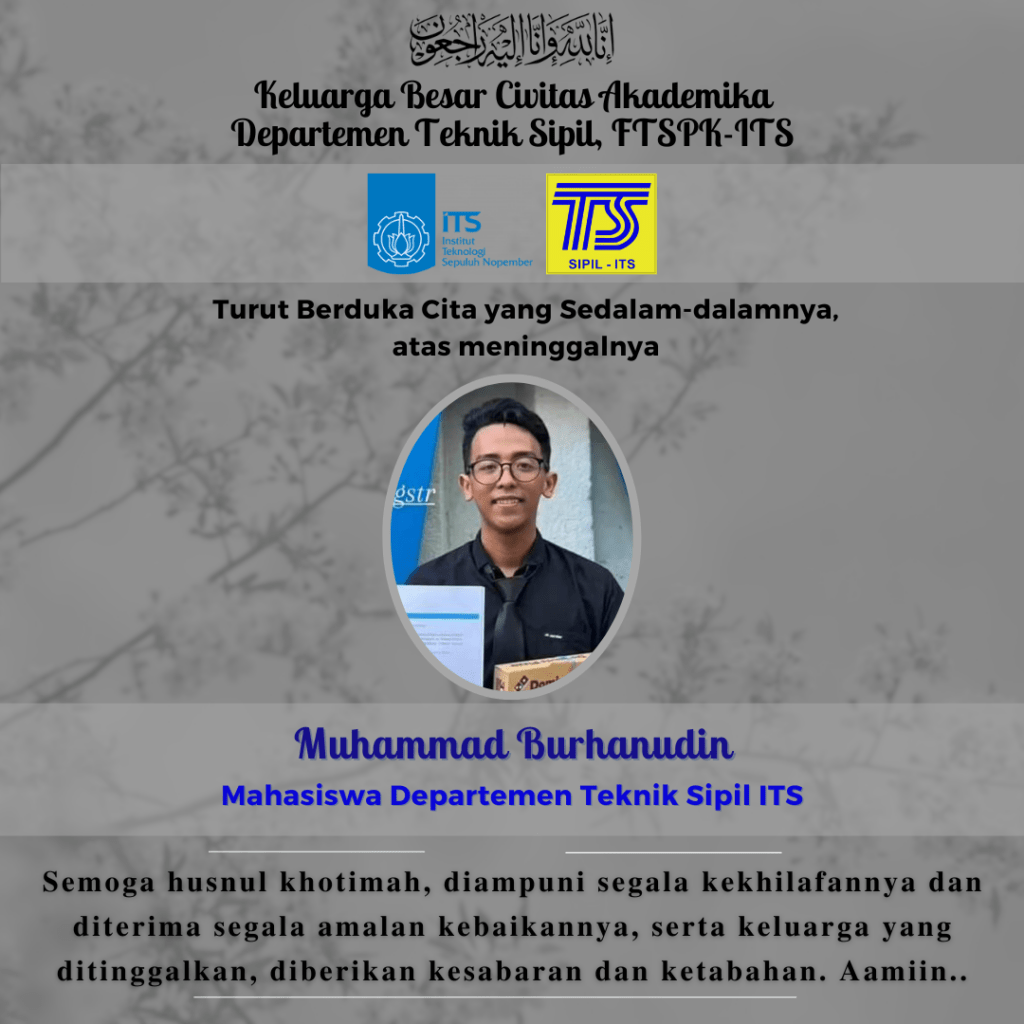 Innalillahi wa inna ilaihi rojiuun, Civitas Akademika Departemen Teknik Sipil kembali berduka, atas berpulangnya Muhammad Burhanudin, Mahasiswa Departemen Teknik Sipil, FT-SPK ITS. Semoga husnul khotimah dan keluarga yang ditinggalkan diberikan kesabaran dan ketabahan. Aamiin..