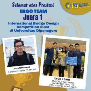 Selamat atas Prestasi Ergo Team, Juara 1 International Bridge Design Competition 2023 yang diadakan di Universitas Diponegoro. Ergo Team bimbingan Dosen Teknik Sipil Achmad Basshofi Habieb, ST, MT, Ph.D yang beranggotakan Gregorius Alexander, Vincent Hans Siputta, dan Moch. Choirul Akbar Majid berhasil meraih juara dengan gemilang. Prestasi yg telah diraih bukan hanya sekedar keberuntungan semata, namun merupakan hasil dari kerja keras, dedikasi & tekad yg tiada henti. Selamat atas Kemenangan ini, semoga membawa kesuksesan di masa yang akan datang.