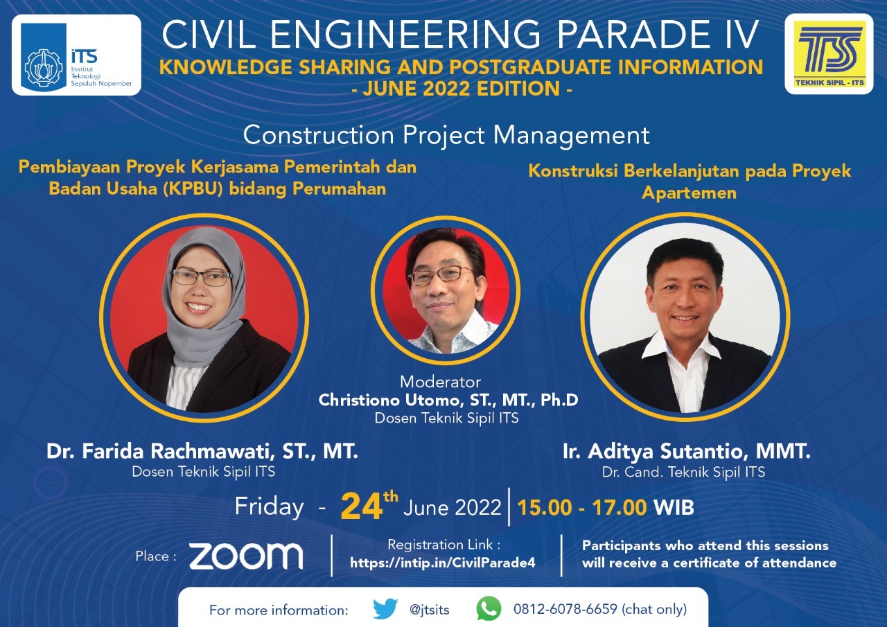 Knowledge Sharing and Postgraduate Enrollment June 2022 Jum’at 24 Juni 2022 Membahas Topik Bidang Manajemen Proyek Konstruksi: Pembiayaan Proyek Kerjasama Pemerintah dan Badan Usaha (KPBU) bidang Perumahan oleh Dr. Farida Rachmawati, ST, MT dan Konstruksi Berkelanjutan pada Proyek Apartemen oleh Ir. Aditya Sutantio, MMT dan dimoderatori oleh Christiono Utomo, ST, MT, Ph.D. Jadwal : 15.00 – 17.00 via Zoom dengan link intip.in/CivilParade4 Gratis mendapatkan E-Sertifikat